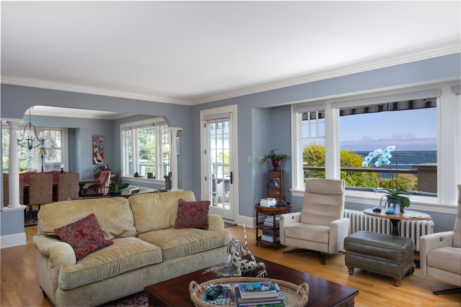 Experience timeless elegance at 261 King George Terrace, a remarkable south-facing waterfront estate in Oak Bay's prestigious Gonzales neighbourhood. Built in 1933 and set on over 0.8 acres, this exquisite home boasts panoramic views of the ocean, Trial Islands, and Olympic Mountains from nearly every room. Watch whales from your beautifully landscaped backyard, framed by incredible natural rockwork. Inside, the home offers the flexibility of one-level living on the main floor featuring a spacious kitchen, formal dining and living room, principal suite, and more—making everyday living exceptionally convenient. Downstairs, a full-height walk-out basement expands your options with additional living space that opens into pristine grounds. Dual driveways each lead to their own detached double garage. With its historic charm, thoughtful layout, and spectacular setting, this is a rare opportunity to own one of Victoria’s most iconic seaside estates.