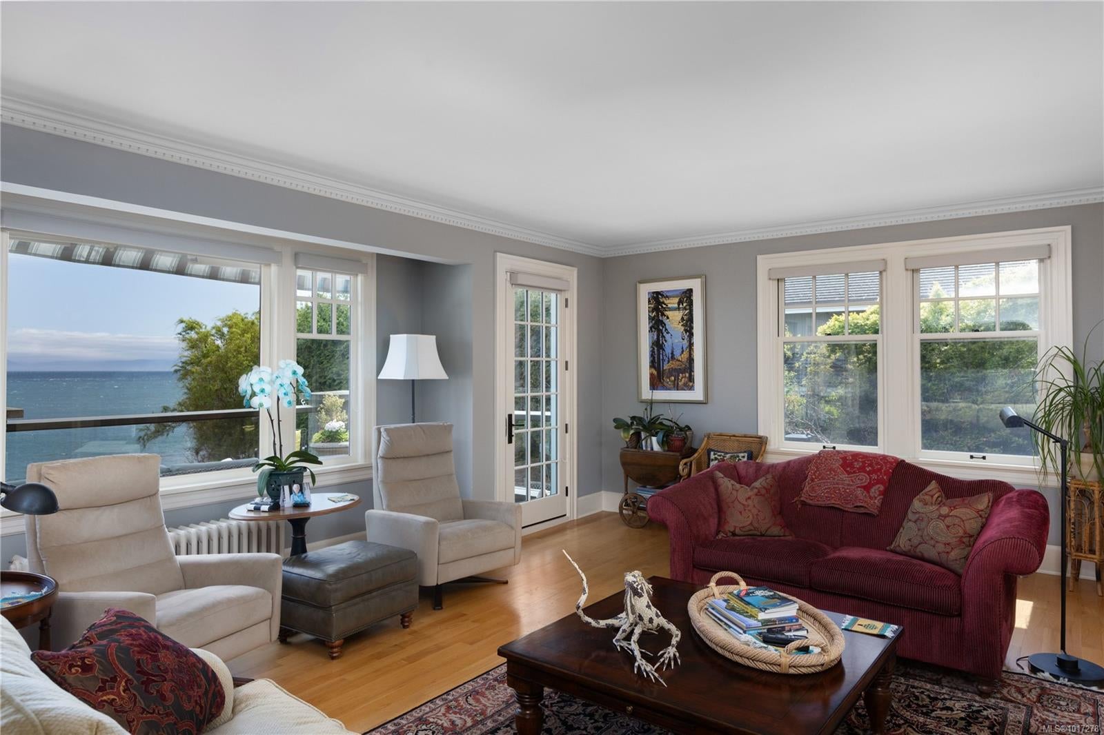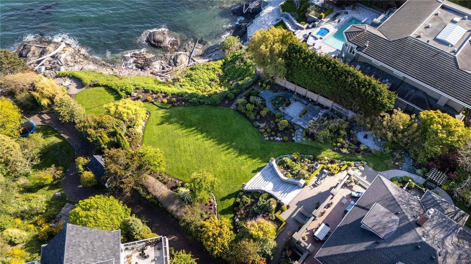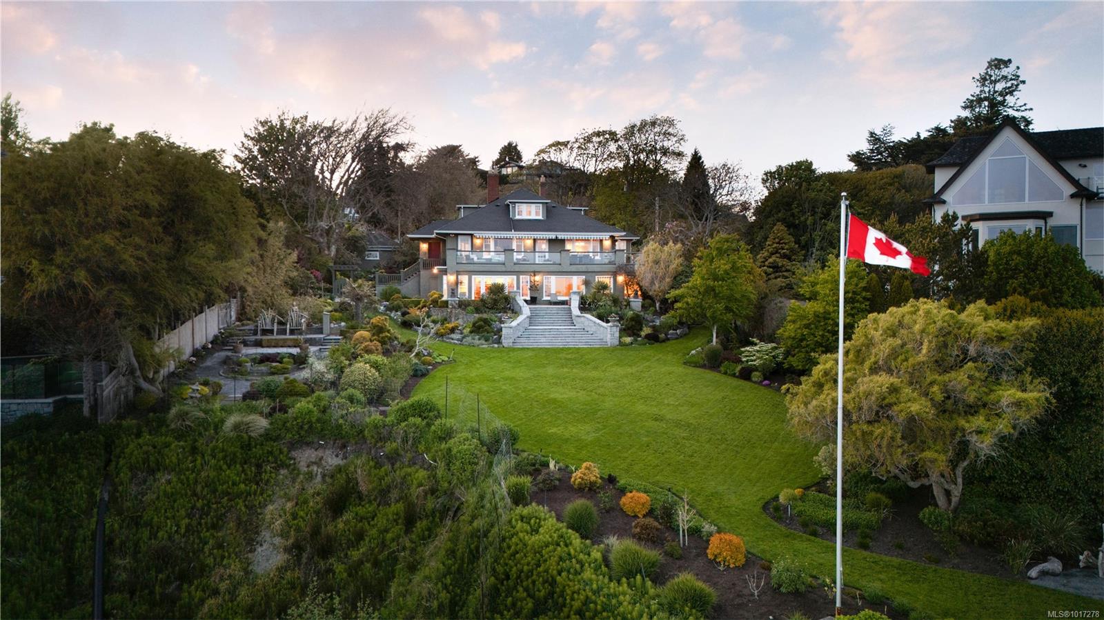 Experience timeless elegance at 261 King George Terrace, a remarkable south-facing waterfront estate in Oak Bay's prestigious Gonzales neighbourhood. Built in 1933 and set on over 0.8 acres, this exquisite home boasts panoramic views of the ocean, Trial Islands, and Olympic Mountains from nearly every room. Watch whales from your beautifully landscaped backyard, framed by incredible natural rockwork. Inside, the home offers the flexibility of one-level living on the main floor featuring a spacious kitchen, formal dining and living room, principal suite, and more—making everyday living exceptionally convenient. Downstairs, a full-height walk-out basement expands your options with additional living space that opens into pristine grounds. Dual driveways each lead to their own detached double garage. With its historic charm, thoughtful layout, and spectacular setting, this is a rare opportunity to own one of Victoria’s most iconic seaside estates.
