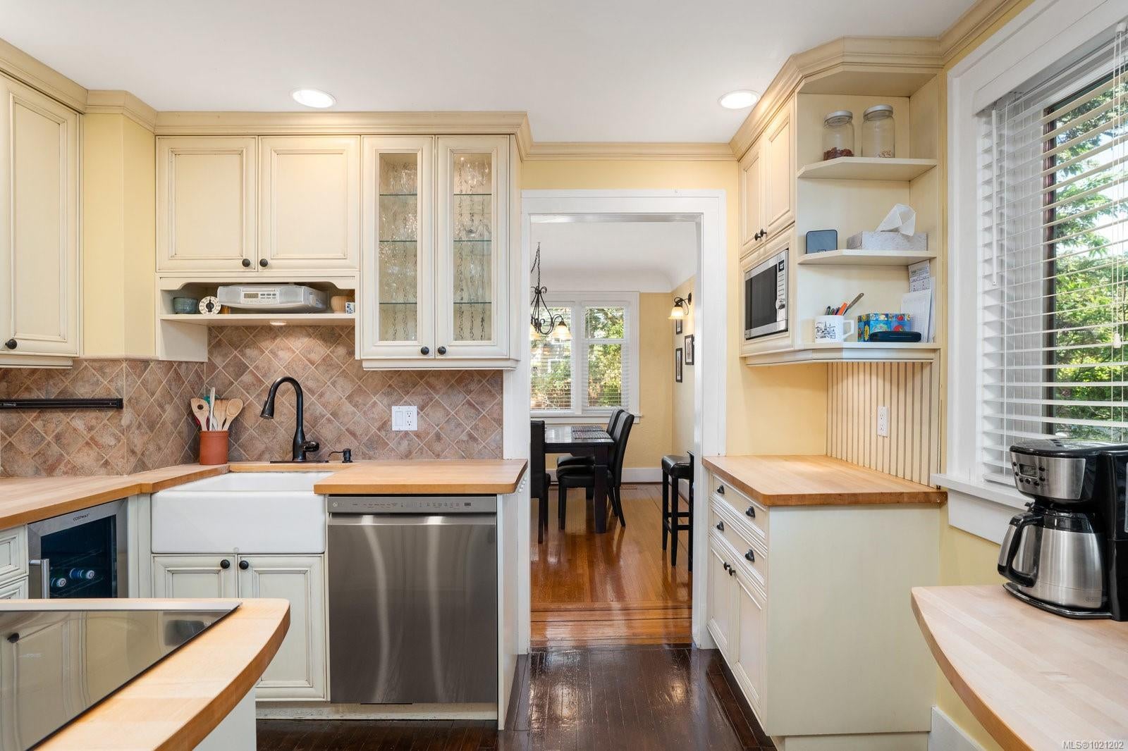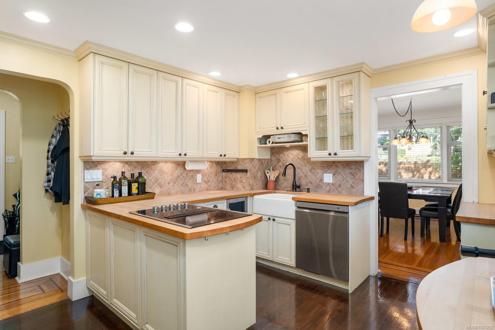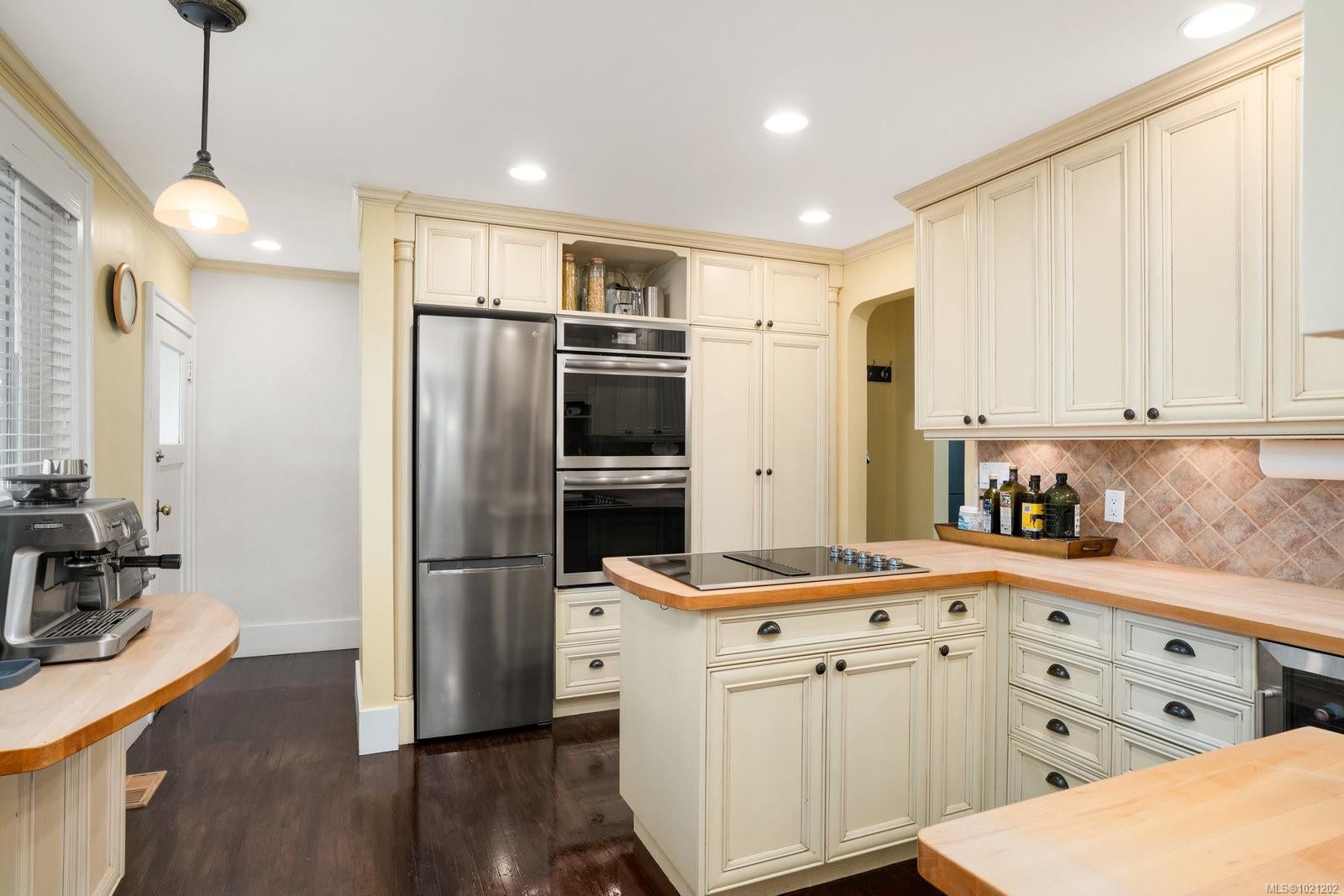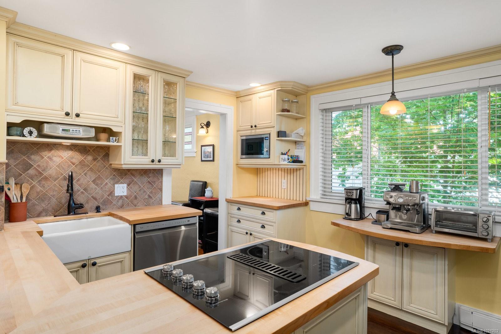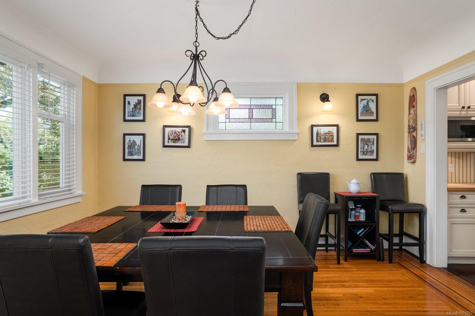 Welcome to 1959 Hampshire Road, a beautifully refurbished character home ideally situated in desirable Oak Bay. This spacious residence offers four bedrooms and two bathrooms within nearly 3,000 square feet of bright, inviting living space. Newly refinished rich oak floors with elegant mahogany inlays and stunning stained glass windows add timeless character throughout, complementing the generous living room centered around a cozy wood-burning fireplace. Enjoy a total of 529 square feet of outdoor space spread across three separate decks, perfect for relaxing or entertaining. Additional highlights include a sauna, a dedicated music room, an office with its own convenient separate entrance, a wood stove for supplemental heating, and abundant storage throughout. Modern upgrades such as enhanced electrical systems and a hot tub bring comfort and style to this exceptional home. A private electric gate provides access to a quiet laneway and the attached garage. Located just a few blocks from Willows Beach, Estevan Village, Oak Bay Village, and close to Willows Elementary and Oak Bay High School, this character-filled home perfectly blends timeless appeal with contemporary living.